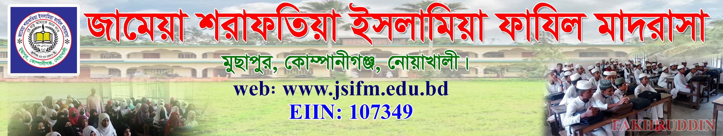 ভর্তি চলছে....................... ভর্তি চলছে নোয়াখালী জেলার ঐতিহ্যবাহী জামেয়া শরাফতিয়া ইসলামিয়া ফাযিল মাদরাসা ২০২৩-২০২৪ সেশনে আলিম শ্রেণিতে ছাত্র-ছাত্রী ভর্তি চলিতেছে। আগ্রহী ছাত্র/ছাত্রীদেরকে মাদরাসা ই.আই.এন নম্বর ব্যবহার করে অনলাইনে আবেদন করতে হবে। এবং আবেদন পরবর্তী অফিসে যোগাযোগ করার জন্য বলা হয়েছে। অধ্যক্ষ বিস্তারিত ওয়েব সাইট: https://www.jsifm.edu.bd/notice-details/12 অফিস নাম্বার-01309107349