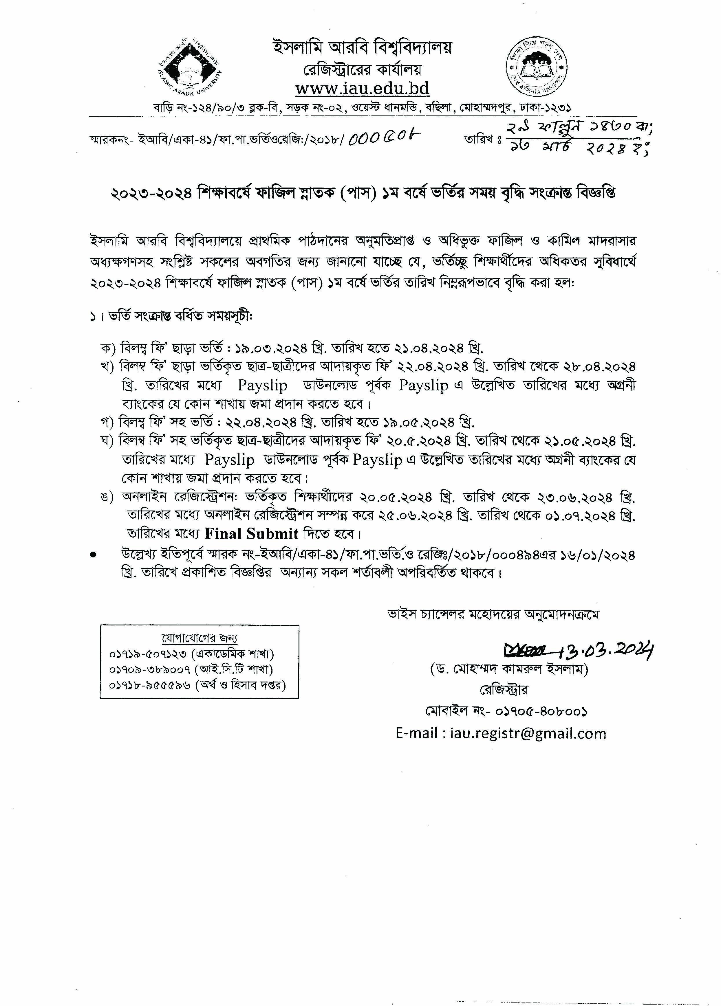 এতদ্বারা ইসলামি আরবি বিশ্ববিদ্যালয়ে প্রার্থমিক পাঠদান অনুমতিপ্রাপ্ত ও অধিভুক্ত ফাযিল ও কামিল মাদরাসার অধ্যক্ষগণসহ সংশ্লিষ্ট সকলের অবগতির জন্য জানানো যাচ্ছে যে, ভর্তিচ্ছু শিক্ষার্থীদের অধিকতর সুবিধার্থে ২০২৩-২০২৪ শিক্ষাবর্ষে ফাযিল স্নাতক (পাস) ১ম বর্ষে ভর্তির তারিখ নিম্নরূপ: ক. ভর্তির তারিখ: ১৯.০৩.২০২৪ খ্রি. থেকে ২১.০৪.২০২৪ তারিখ পর্যন্ত।