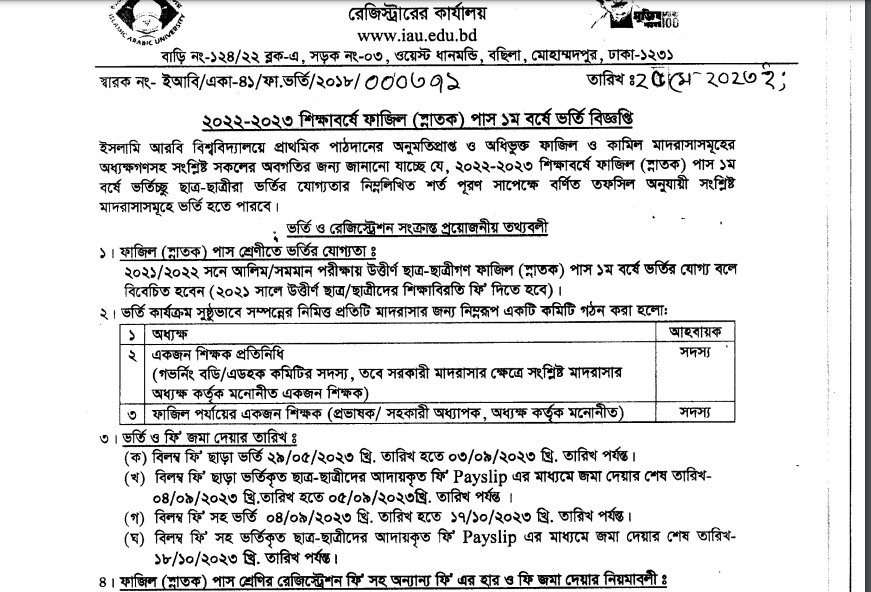 এতদ্বারা জামেয়া শরাফতিয়া ইসলামিয়া ফাযিল মাদরাসা, মুছাপুর, কোম্পানীগঞ্জ, নোয়াখালী এর ২০২২-২০২৩ শিক্ষাবর্ষে (ফাযিল (স্নাতক) ১ম বর্ষে ছাত্র/ছাত্রী ভর্তি চলিতেছে। আগ্রহী ছাত্র/ছাত্রীদেরকে ভর্তি কার্যক্রম সম্পন্ন করার জন্য মাদরাসা অফিসে যোগাযোগ করার জন্য বলা হয়েছে। ভর্তি হওয়ার শেষ তারিখ: 25-05-2023 থেকে 03-09-2023 জানার জন্য মাদরাসার ওয়েব সাইট: www.jsifm.edu.bd ভর্তি বিস্তারিত তথ্য লিংক: https://iau.edu.bd/wp-content/uploads/2023/05/adm000371.pdf